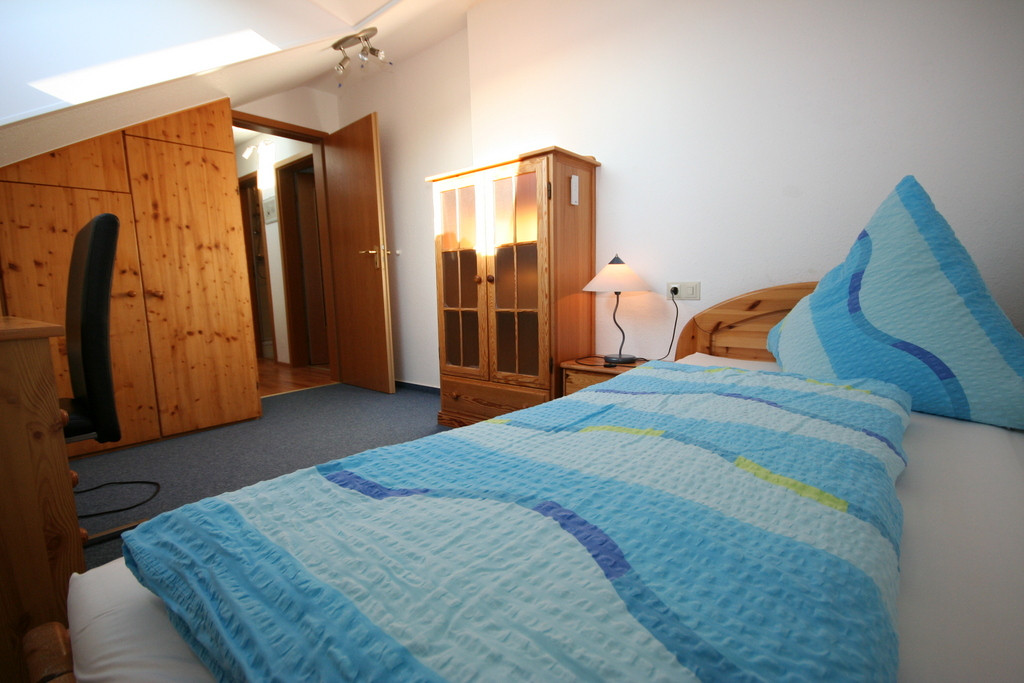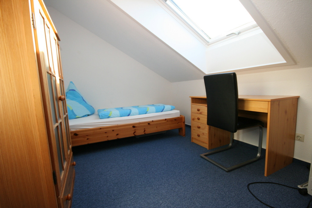 Das Schlafzimmer bietet in unserer Dachwohnung großzügig Platz für eine dritte Person. Durch das große Dachfenster haben Sie immer viel Licht im Zimmer, können es aber durch einen elektrischen Aussenrolladen komplett abdunkeln. Ein Einbauschrank bietet Platz für ihre Kleidung und ein Schreibtisch lädt ein, das erlebte schriftlich festzuhalten. Das Zimmer ist kein Durchgangszimmer, sie haben also auf jeden Fall Ihre Ruhe.