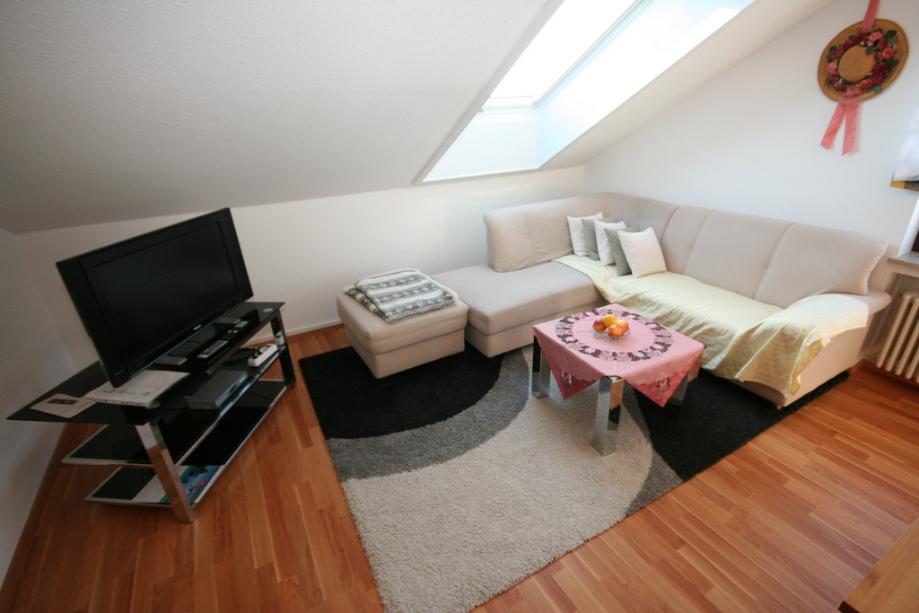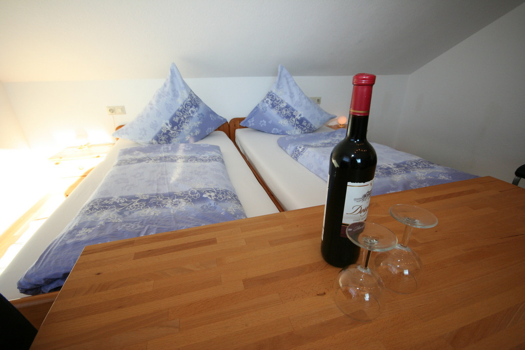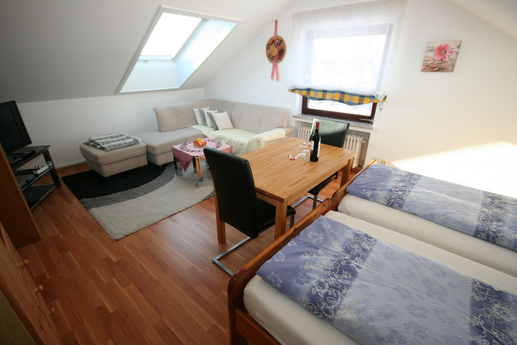 Im Wohnschlafzimmer befindet sich zwei Einzelbetten die normalerweise zum Doppelbett zusammengestellt sind. Ein Esstisch für 3 Personen, eine gemütliche Couch sowie ein LED-TV mit Satelliten-Empfang rundet den Bereich des Wohnschlafzimmers ab.